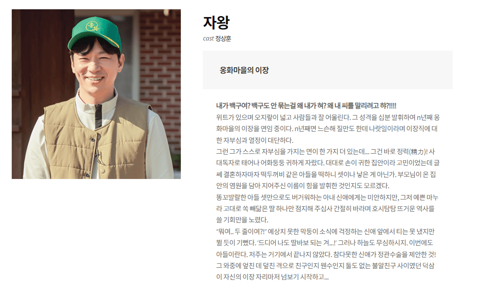 그 성격을 십분 발휘하여 n년째 옹화마을의 이장을 연임 중이다.